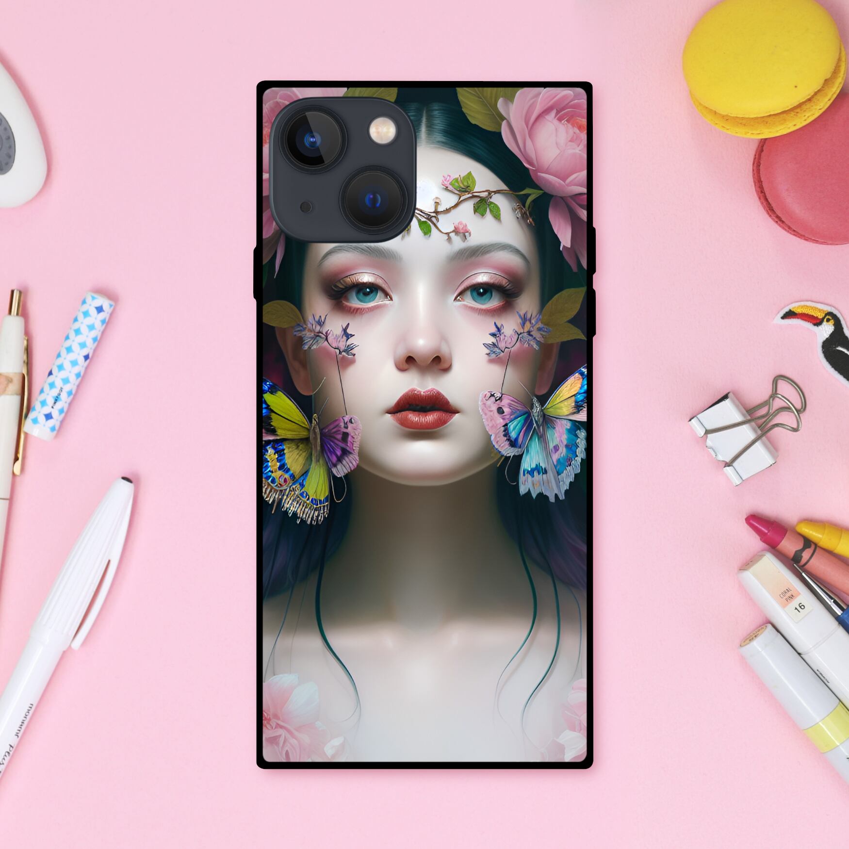 ゆめかわいい女の子と花や色鮮やかできらびやかな蝶 スクエア型スマホケース【強化ガラス仕上げ】