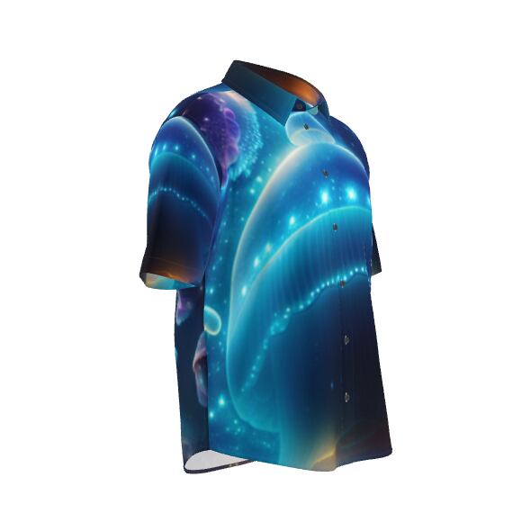 宇宙のような深海で泳ぐ幻想的でゆめかわいいきらびやかなネオン色に光るクラゲ ボタンアップシャツ 半袖